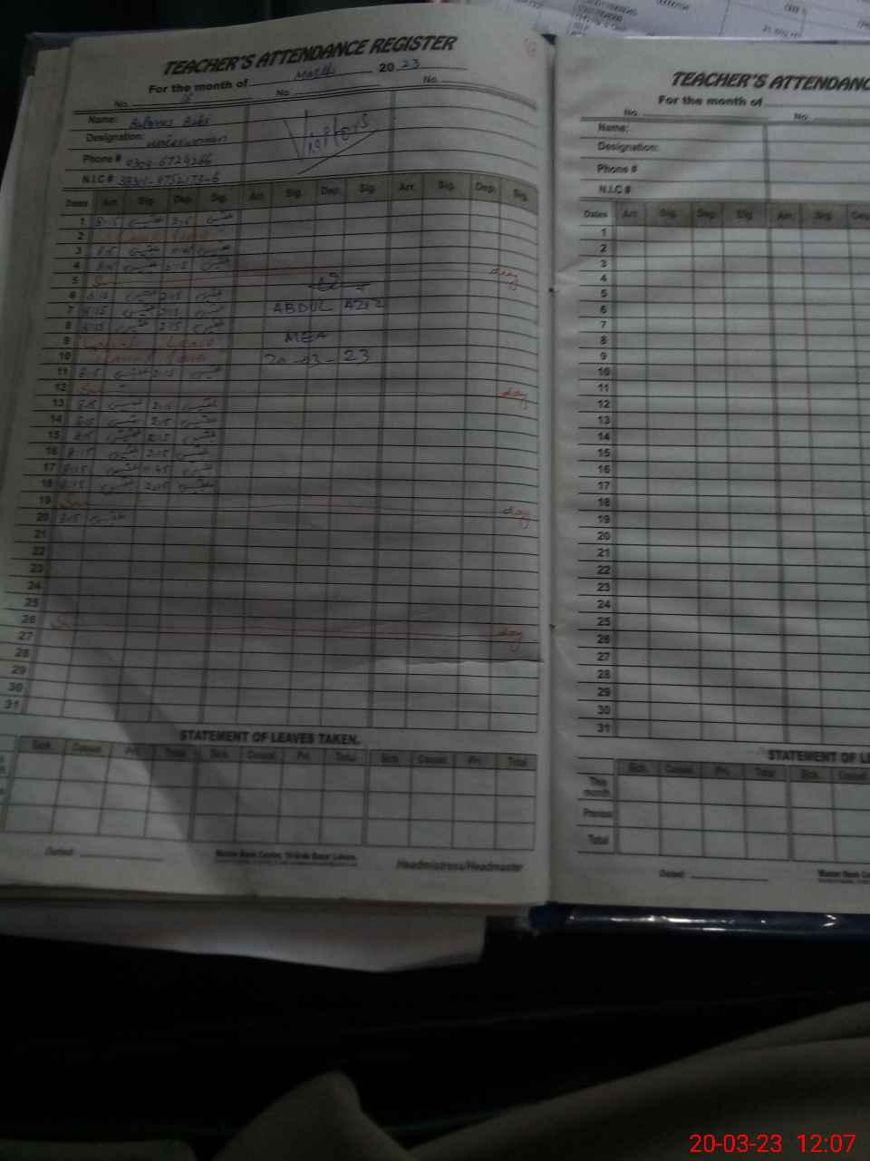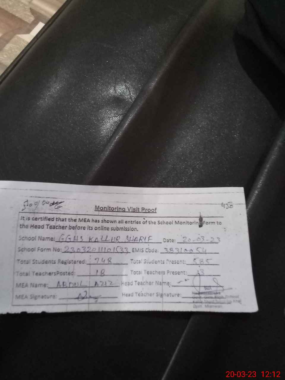 | Attendance Register | Head Teacher | MEA with School | Visit Proof |