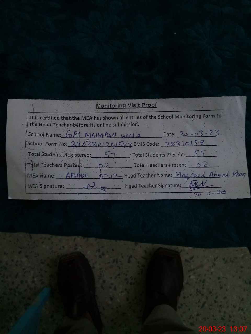 | Attendance Register | Head Teacher | MEA with School | Visit Proof |