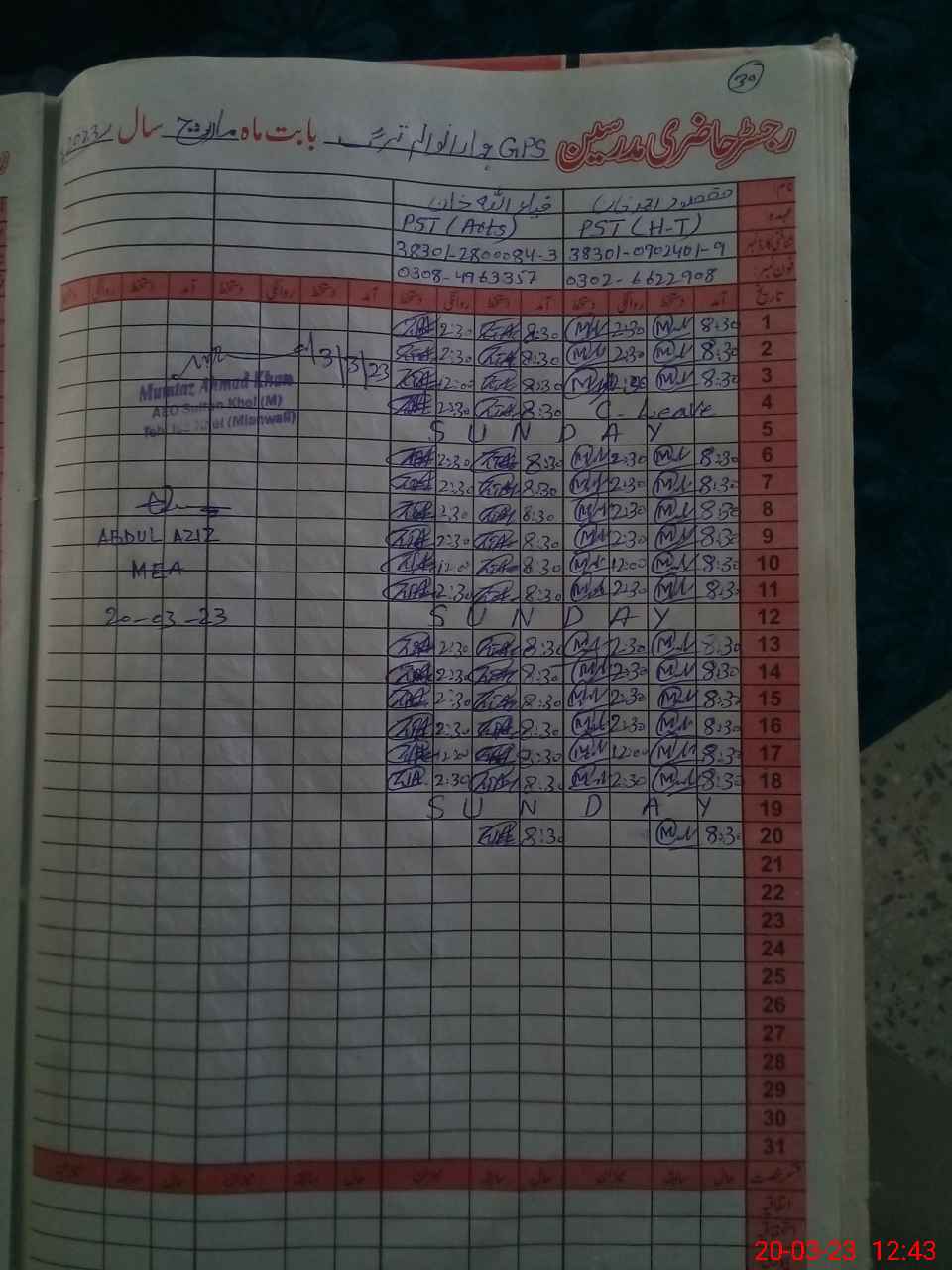 | Name: Zi**** Ul**** Kh**** Designation: (School Headmaster's/Headmistress's) PST Phone/Cell Number: 03**** |