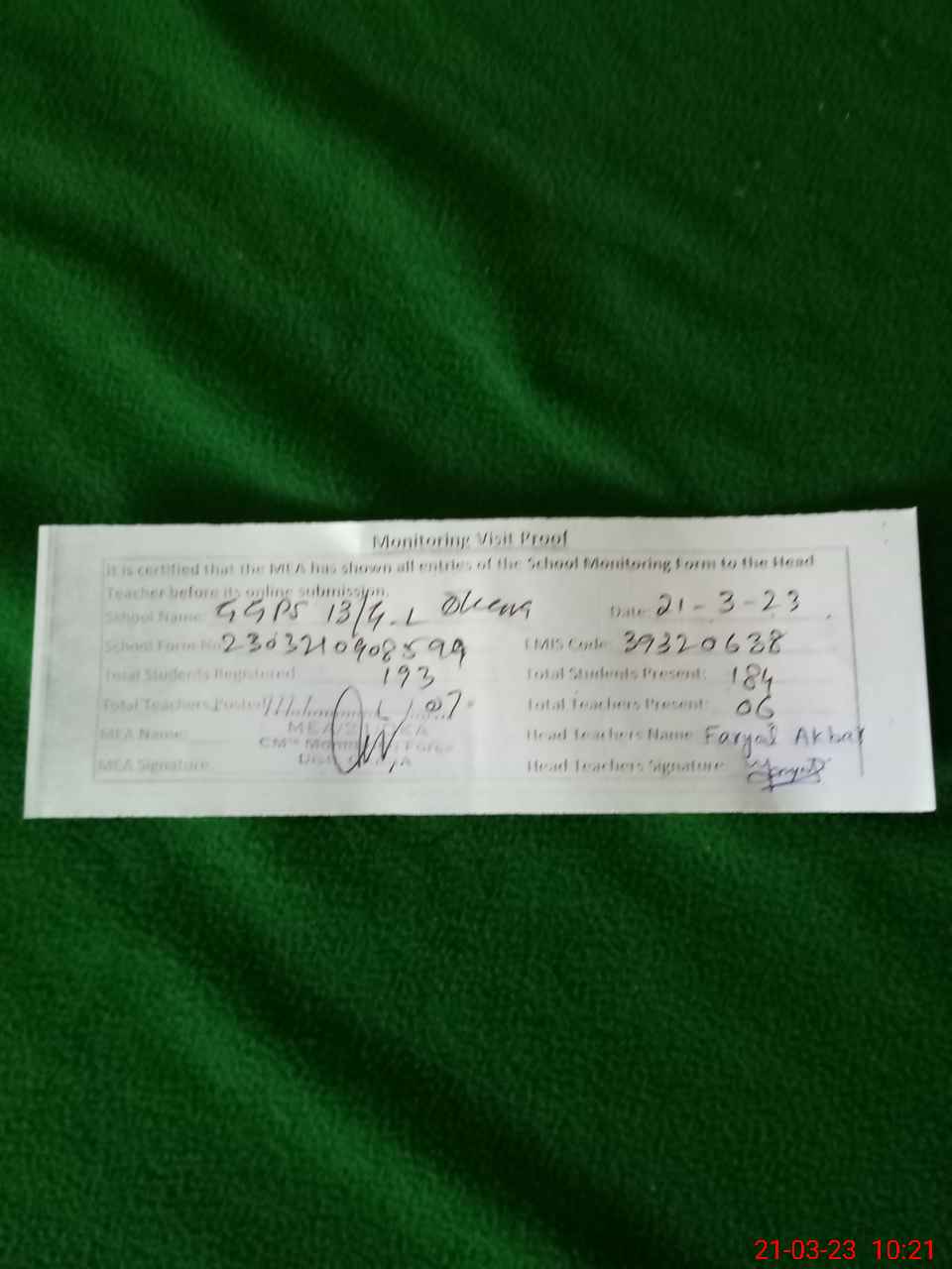 | Certified that this School was Inspected by the Undersigned MEA/DMO Today and the Information Stated Above is as Per Record. | |||||