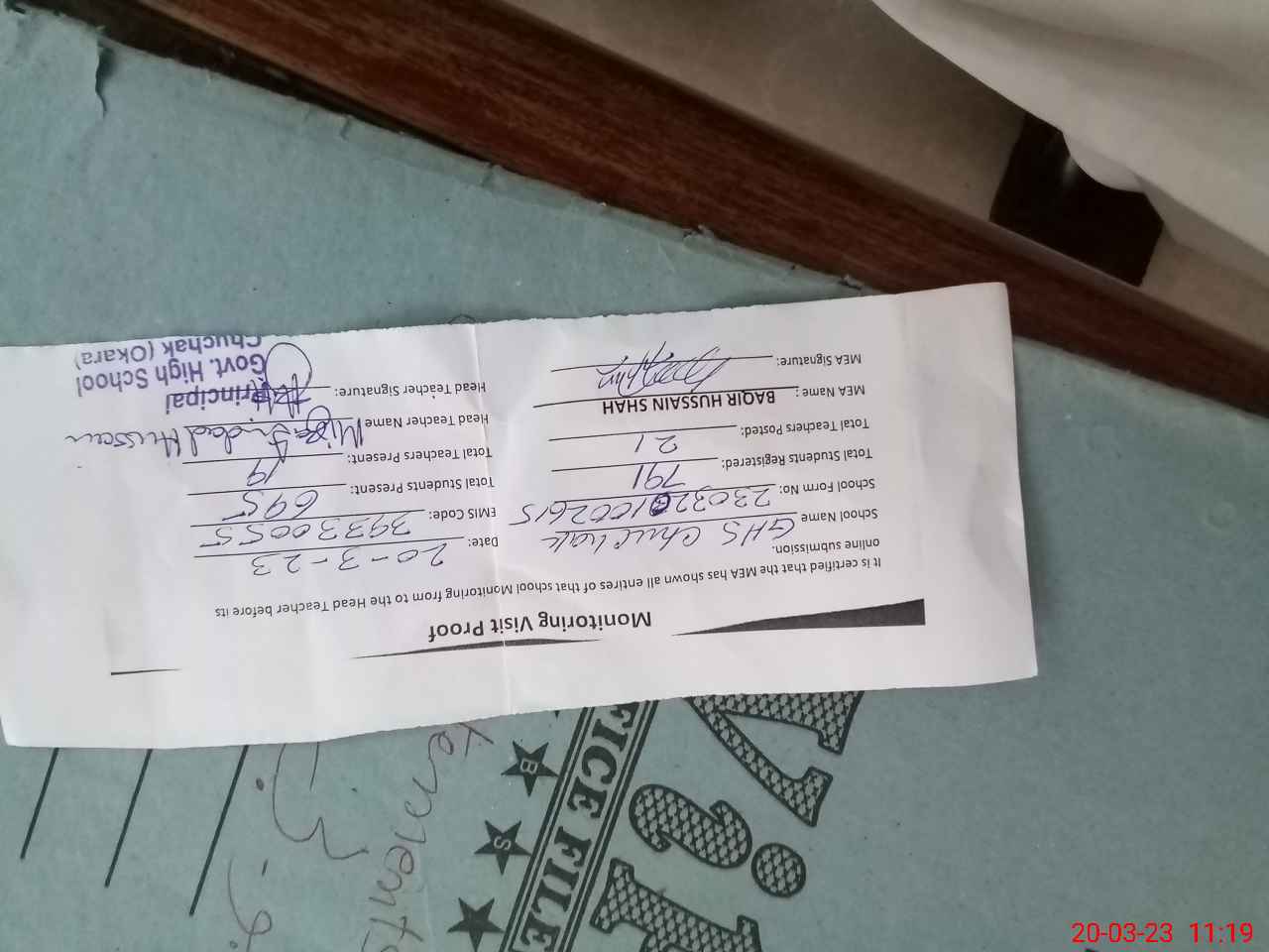 | Attendance Register | Head Teacher | MEA with School | Visit Proof |
