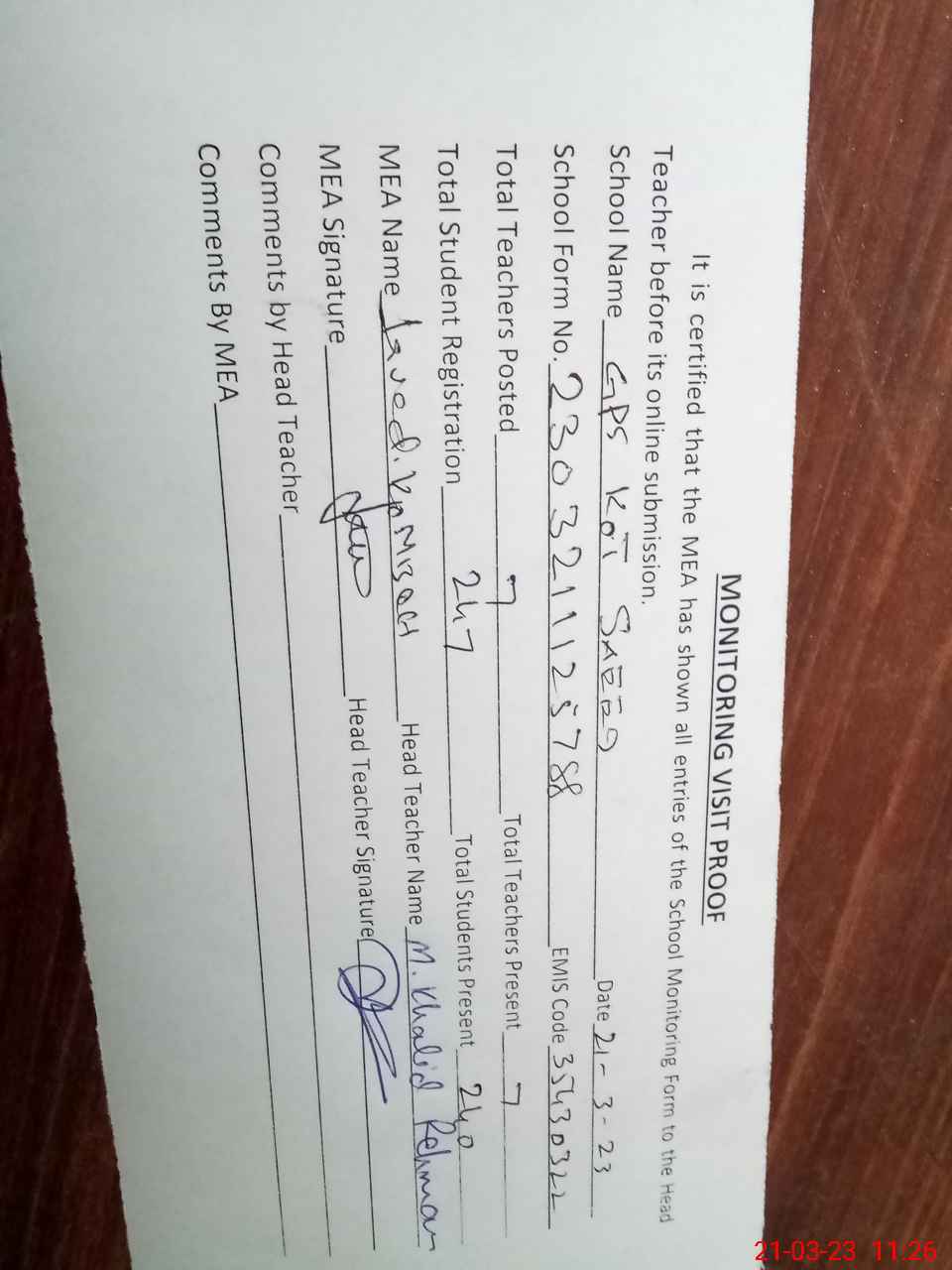 | Attendance Register | Head Teacher | MEA with School | Visit Proof |