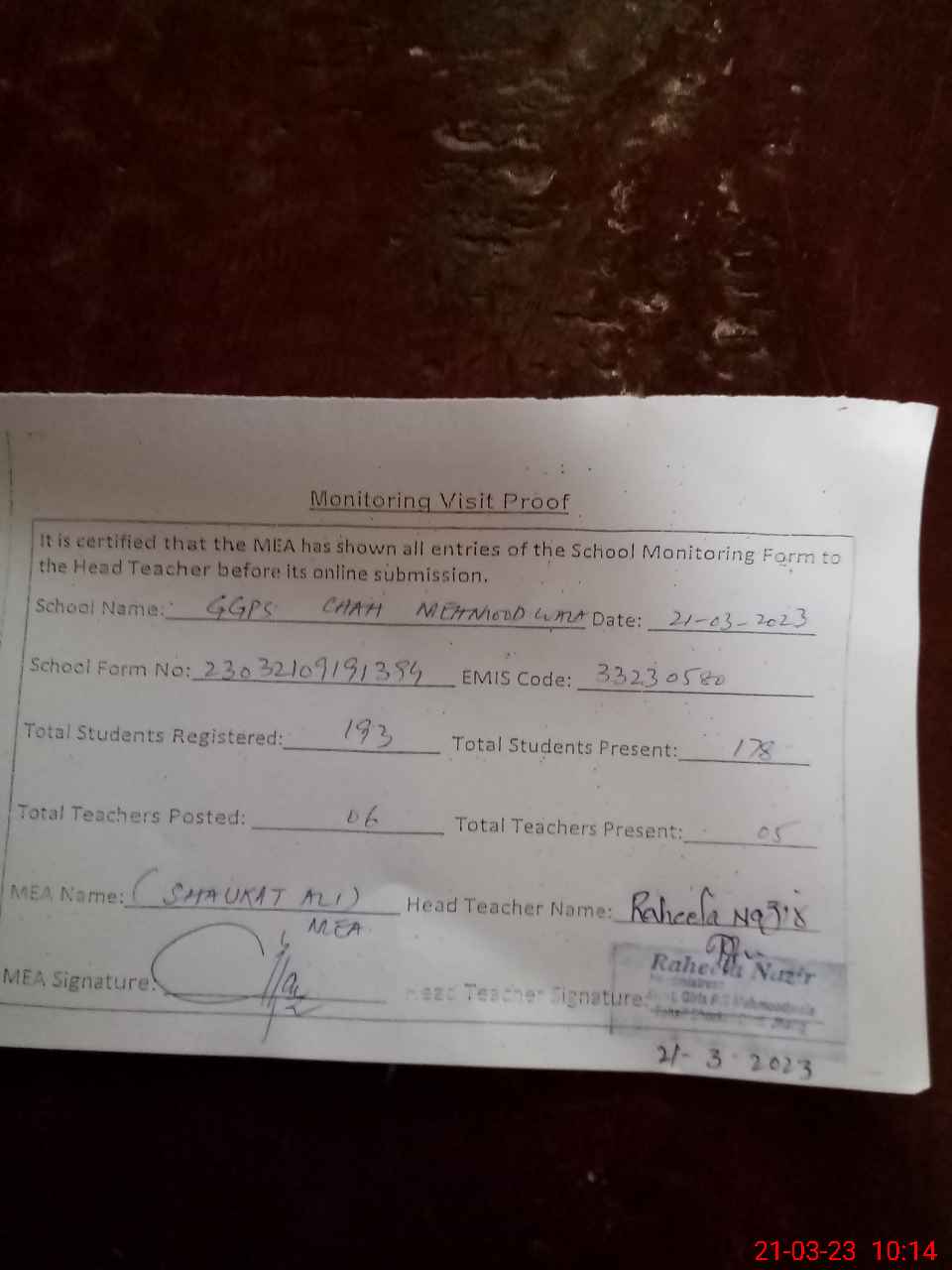 | Attendance Register | Head Teacher | MEA with School | Visit Proof |