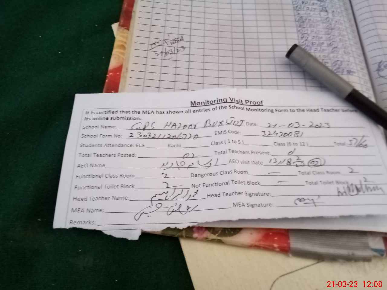 | Attendance Register | Head Teacher | MEA with School | Visit Proof |