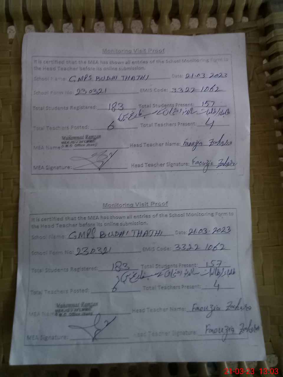 | Attendance Register | Head Teacher | MEA with School | Visit Proof |