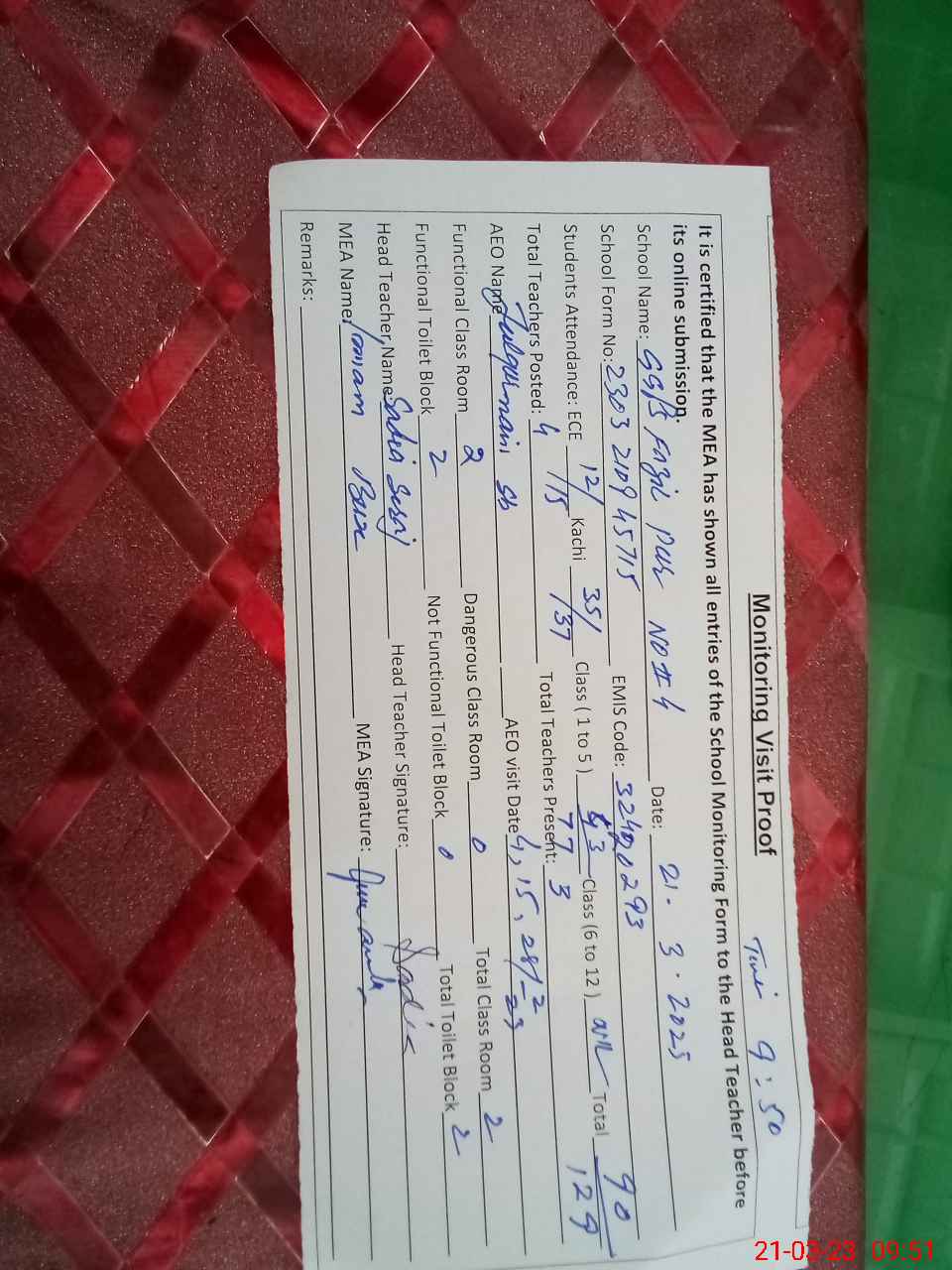 | Attendance Register | Head Teacher | MEA with School | Visit Proof |