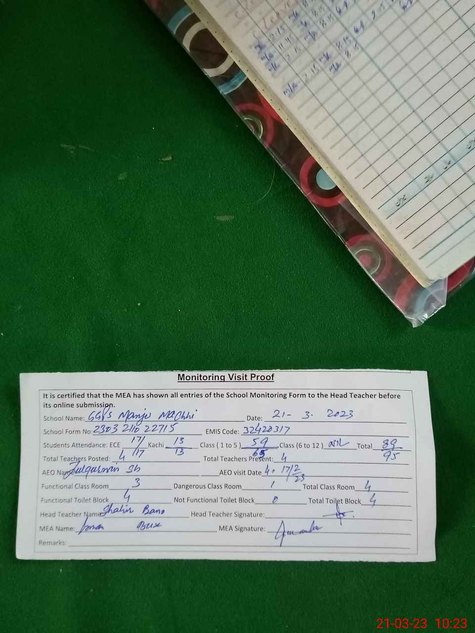 | Attendance Register | Head Teacher | MEA with School | Visit Proof |