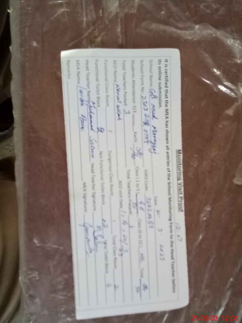| Attendance Register | Head Teacher | MEA with School | Visit Proof |