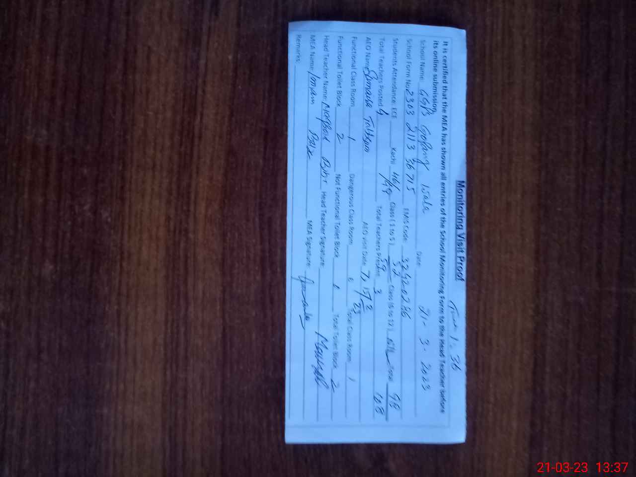 | Attendance Register | Head Teacher | MEA with School | Visit Proof |