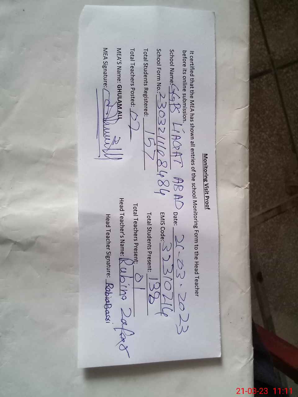 | Attendance Register | Head Teacher | MEA with School | Visit Proof |