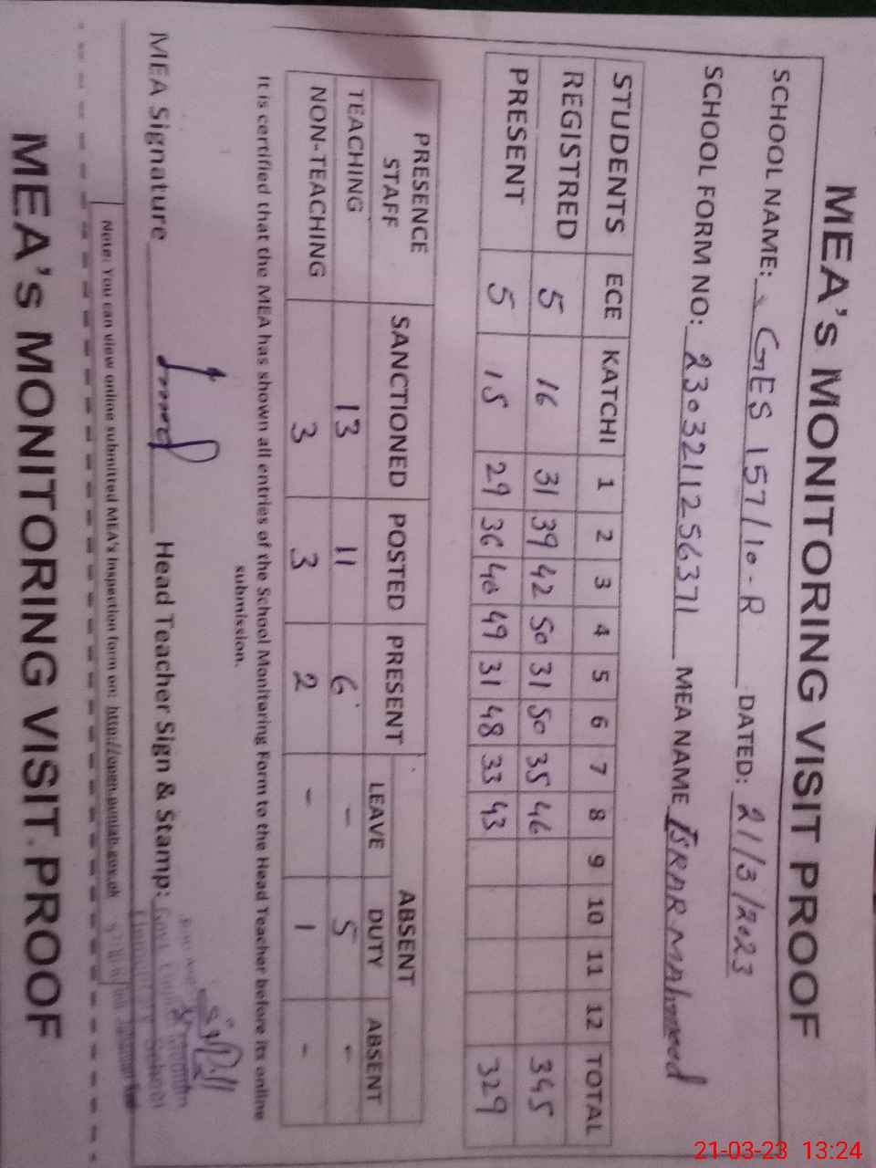 | Attendance Register | Head Teacher | MEA with School | Visit Proof |