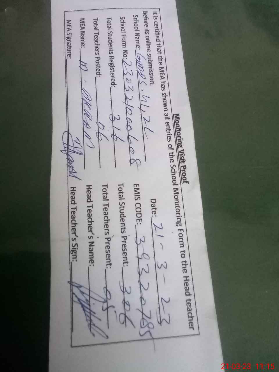 | Attendance Register | Head Teacher | MEA with School | Visit Proof |