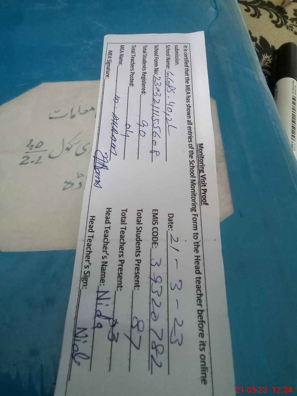 | Attendance Register | Head Teacher | MEA with School | Visit Proof |