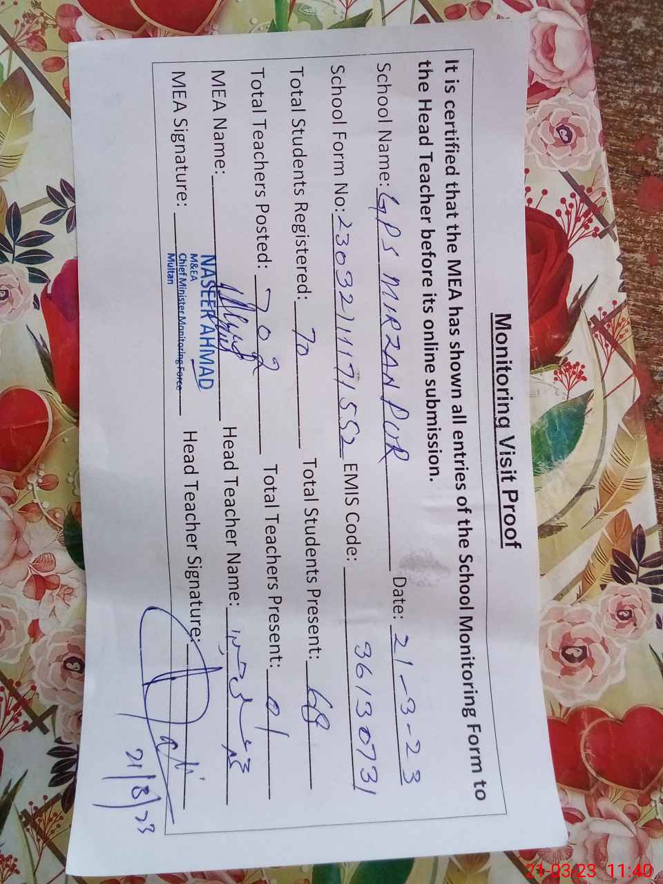 | Attendance Register | Head Teacher | MEA with School | Visit Proof |