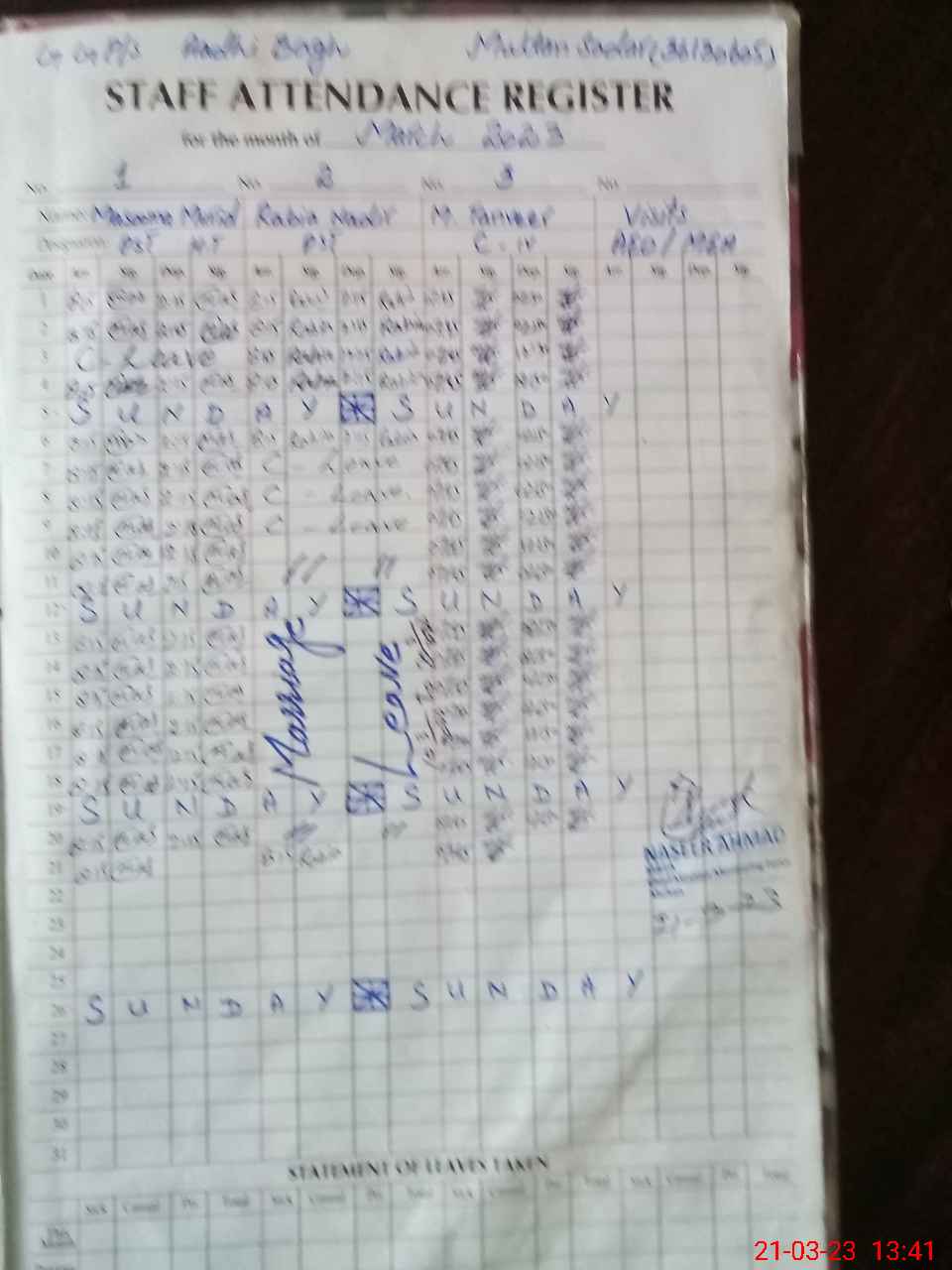 | CNIC | Full Name | Designation | R/C | Absence During Last Calender Month |
