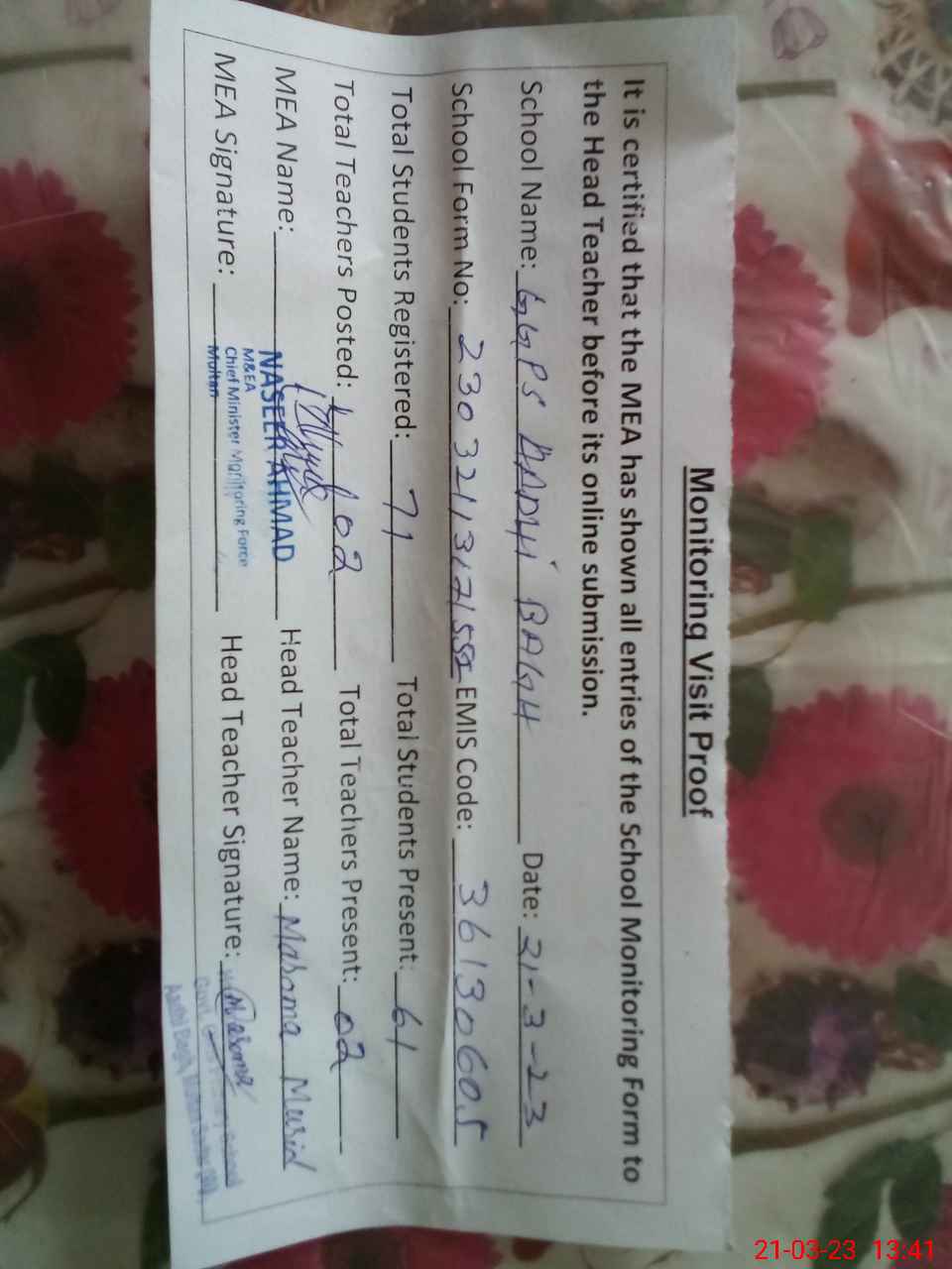 | Attendance Register | Head Teacher | MEA with School | Visit Proof |