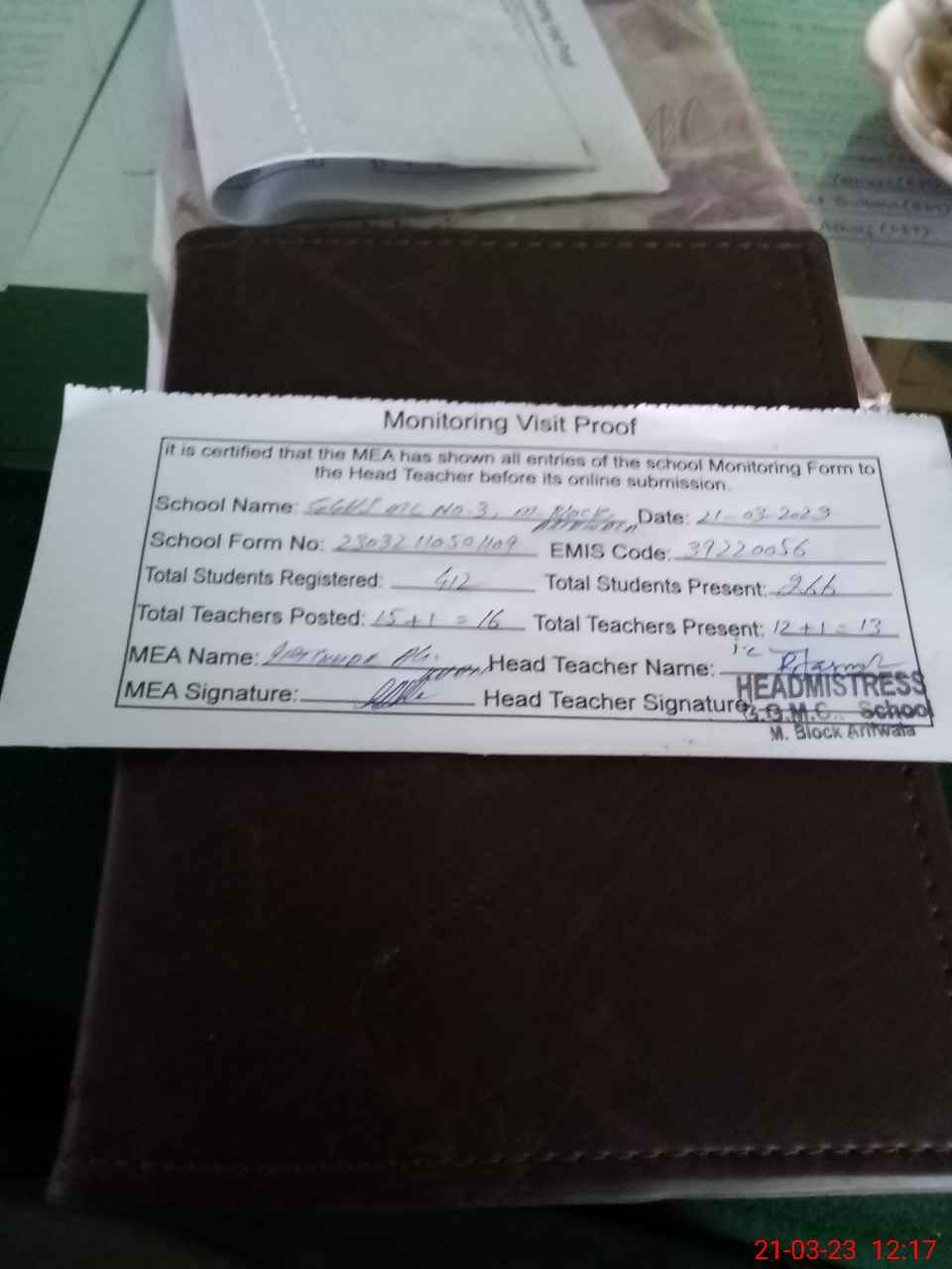 | Attendance Register | Head Teacher | MEA with School | Visit Proof |