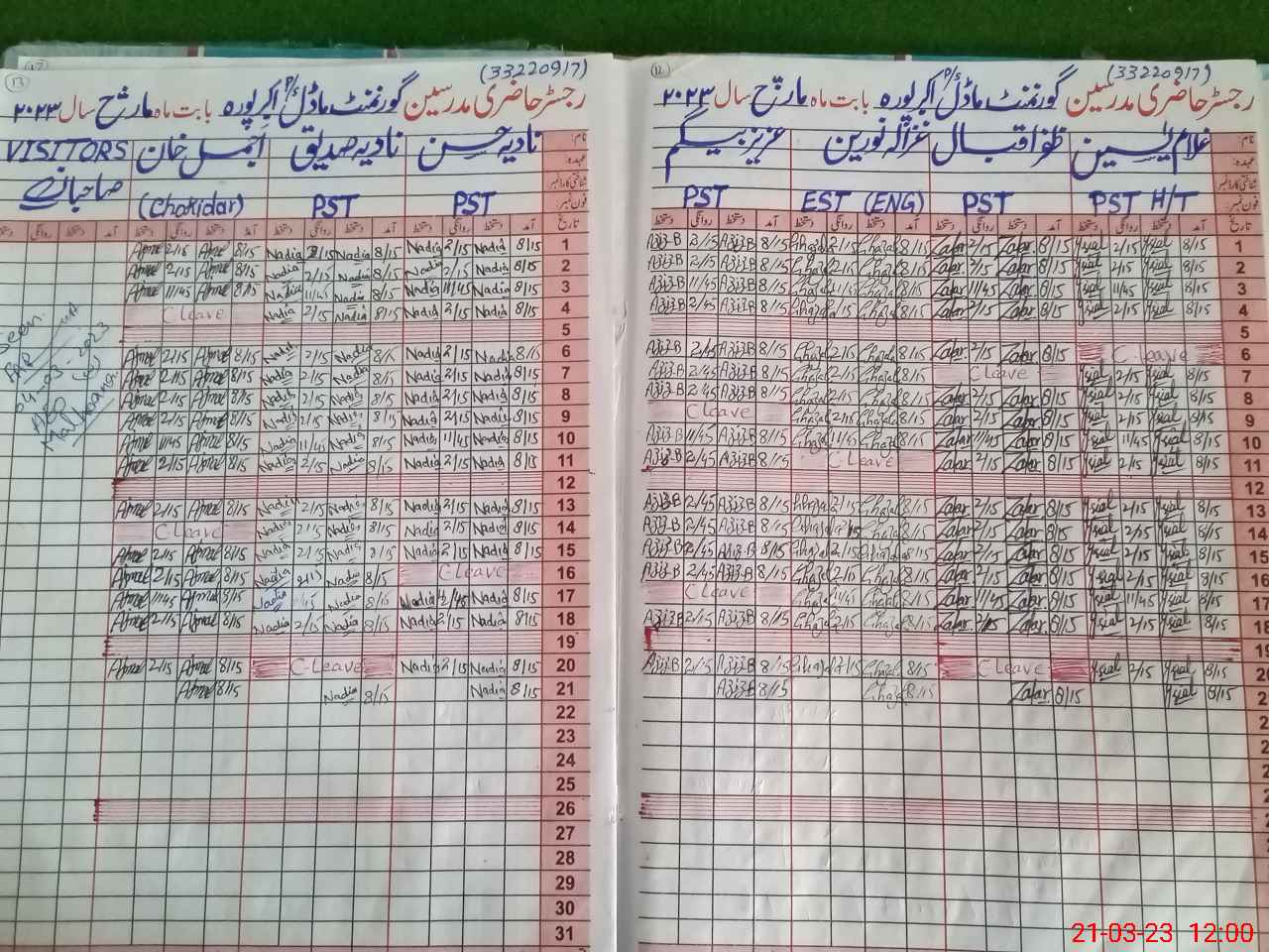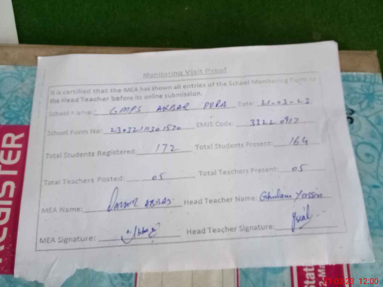 | Attendance Register | Head Teacher | MEA with School | Visit Proof |