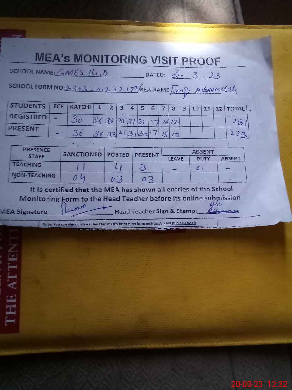 | Attendance Register | Head Teacher | MEA with School | Visit Proof |