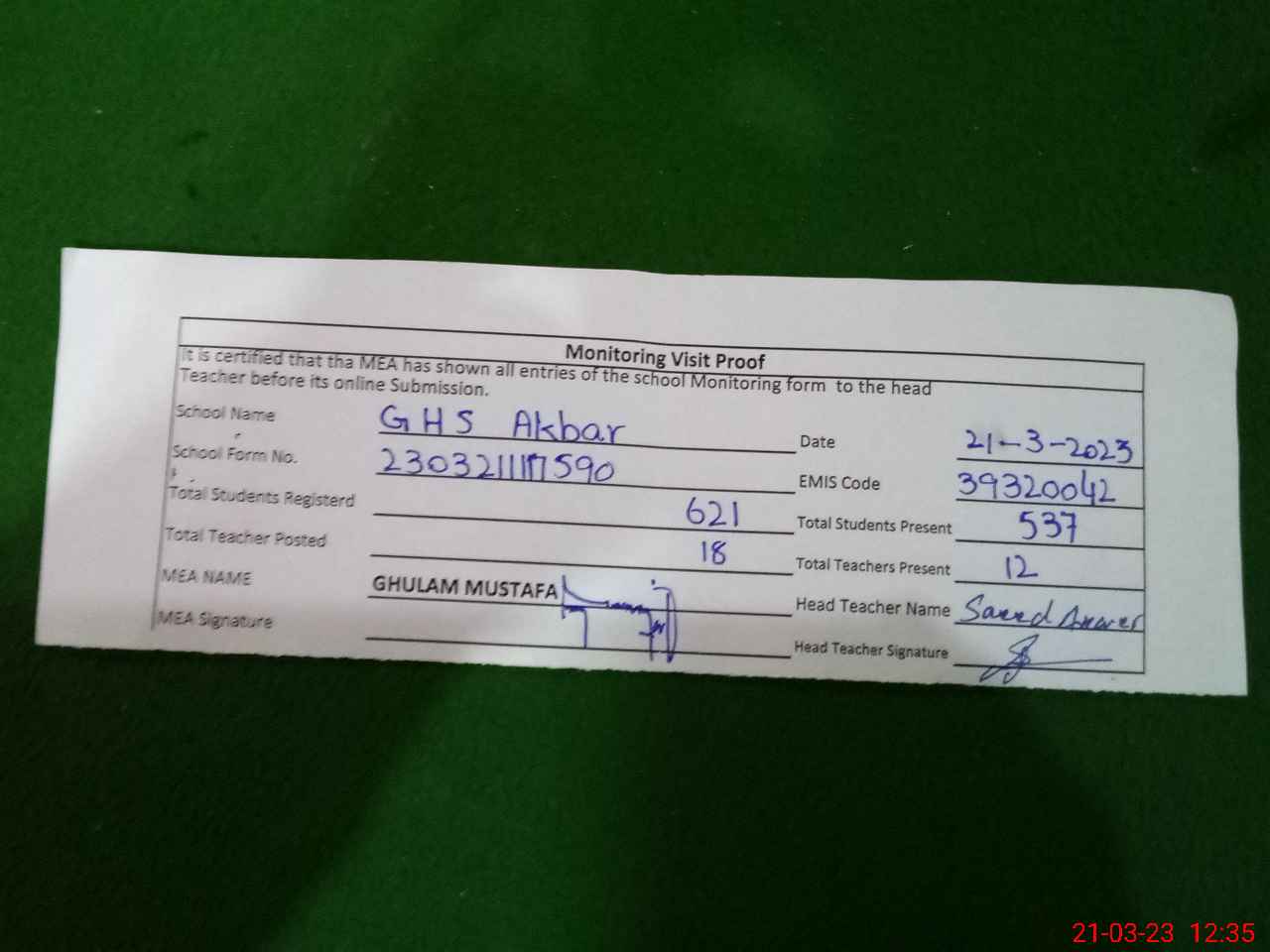 | Attendance Register | Head Teacher | MEA with School | Visit Proof |
