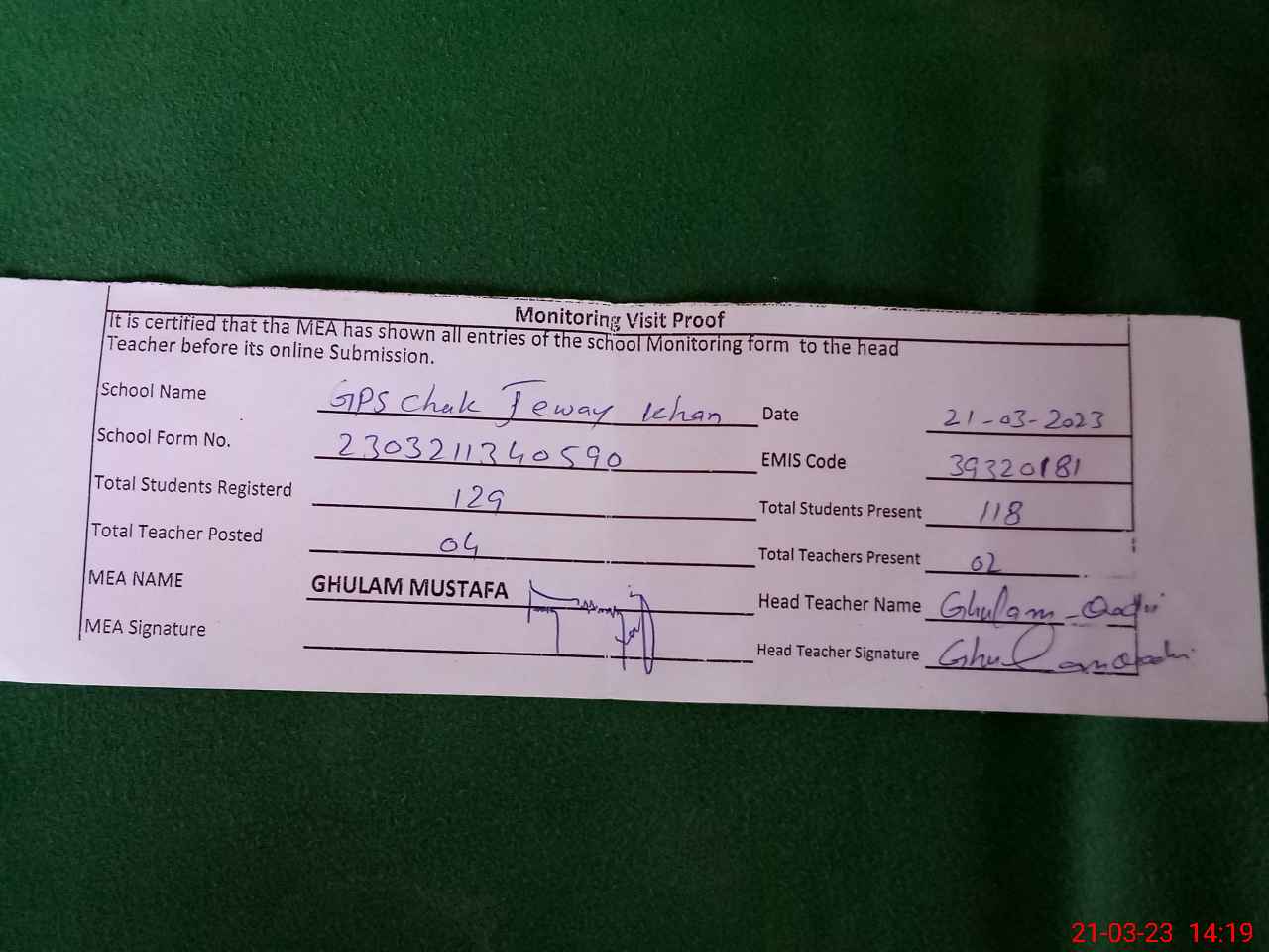 | EMIS Code: 39320181 | Name of School: GPS CHAK JEWAY KHAN | |||