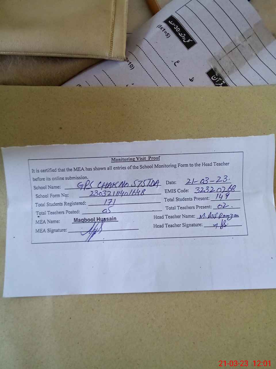 | Attendance Register | Head Teacher | MEA with School | Visit Proof |