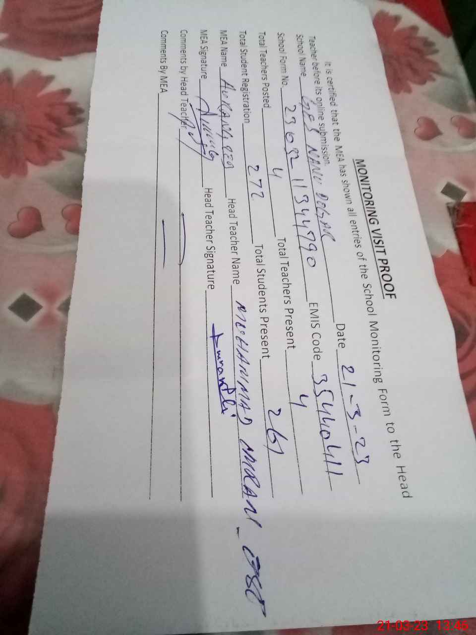 | Attendance Register | Head Teacher | MEA with School | Visit Proof |