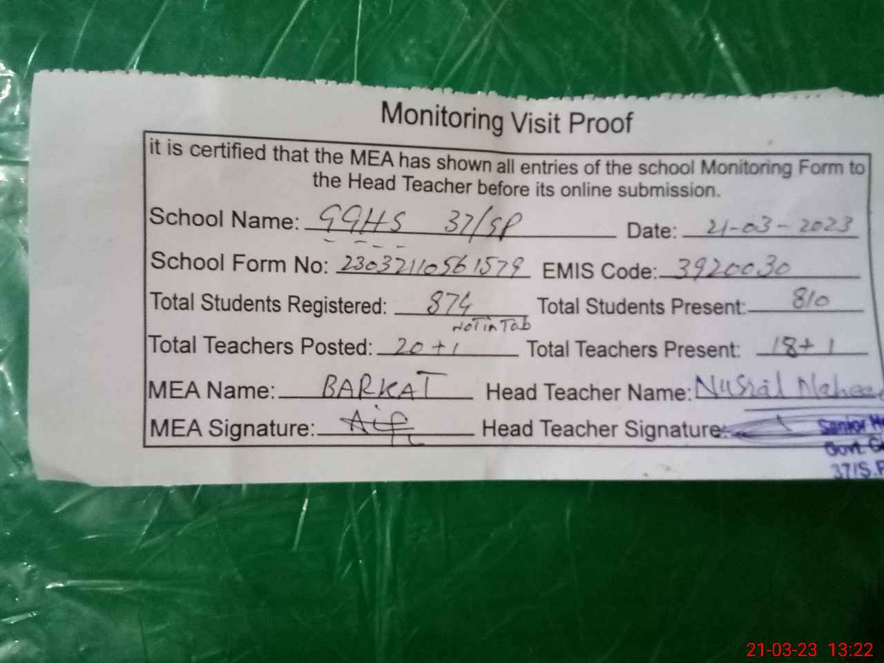 | EMIS Code: 39210030 | Name of School: GGHS 37 SP PAKPATTAN | |||