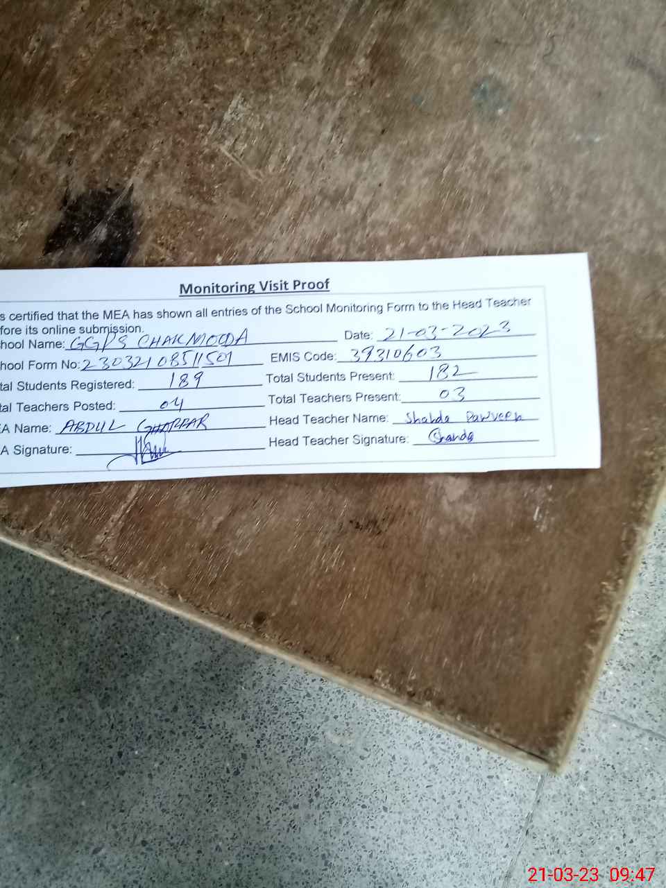 | Attendance Register | Head Teacher | MEA with School | Visit Proof |