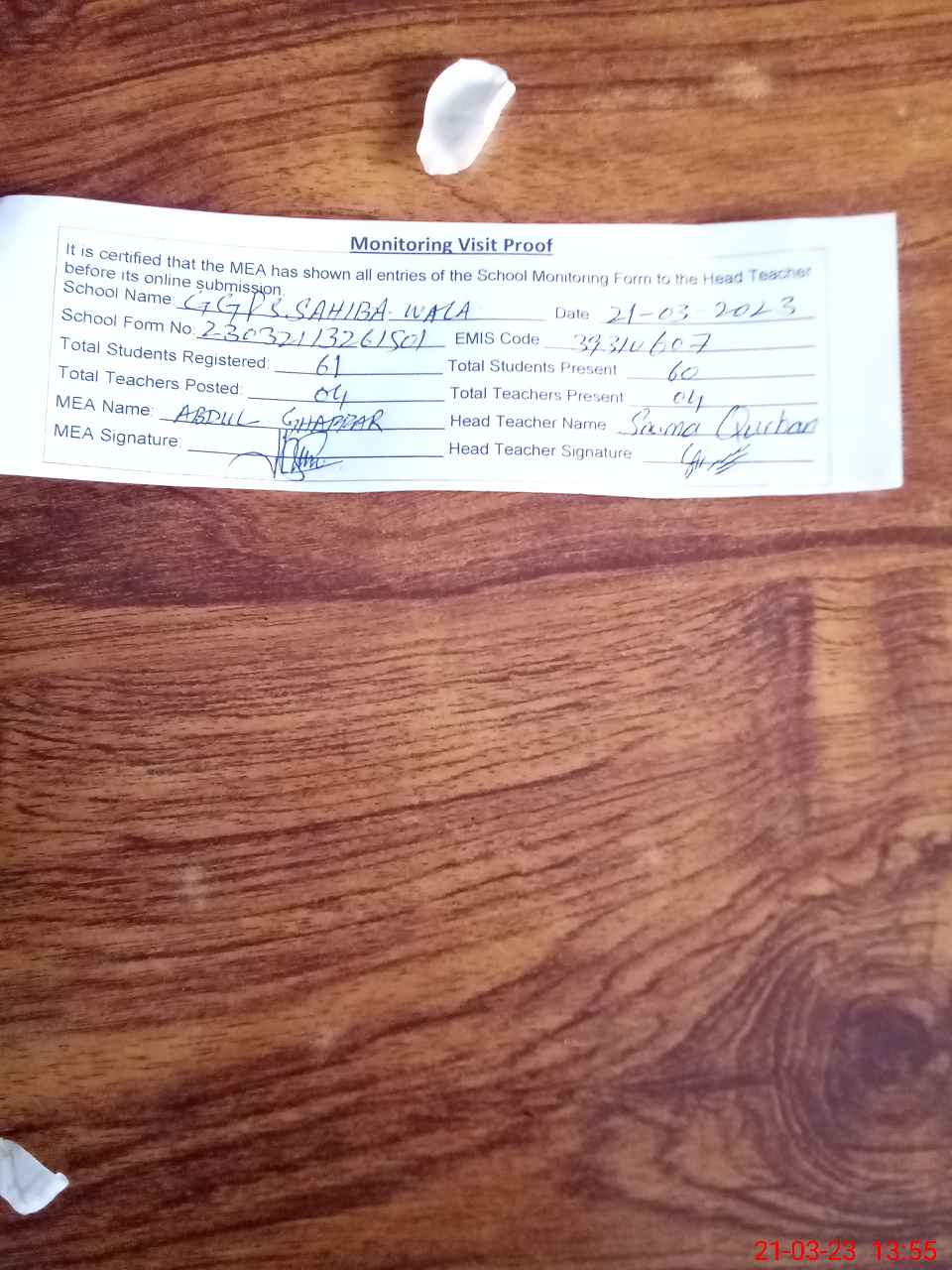 | EMIS Code: 39310607 | Name of School: GGPS SAHIBA WALA NO. 1 | |||