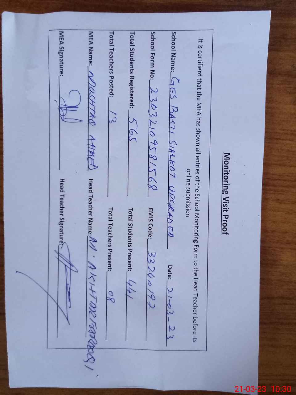 | Certified that this School was Inspected by the Undersigned MEA/DMO Today and the Information Stated Above is as Per Record. | |||||