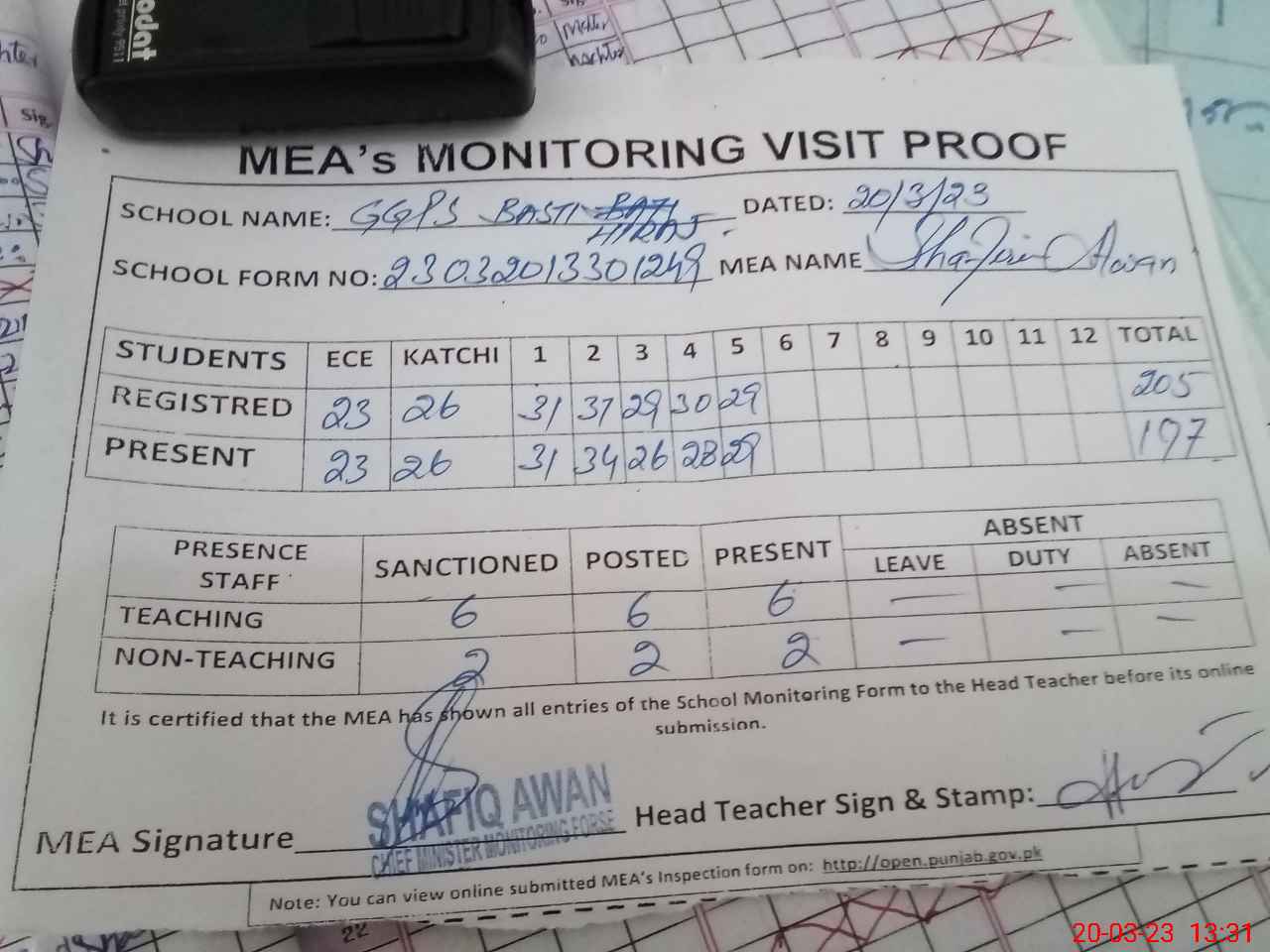 | Attendance Register | Head Teacher | MEA with School | Visit Proof |