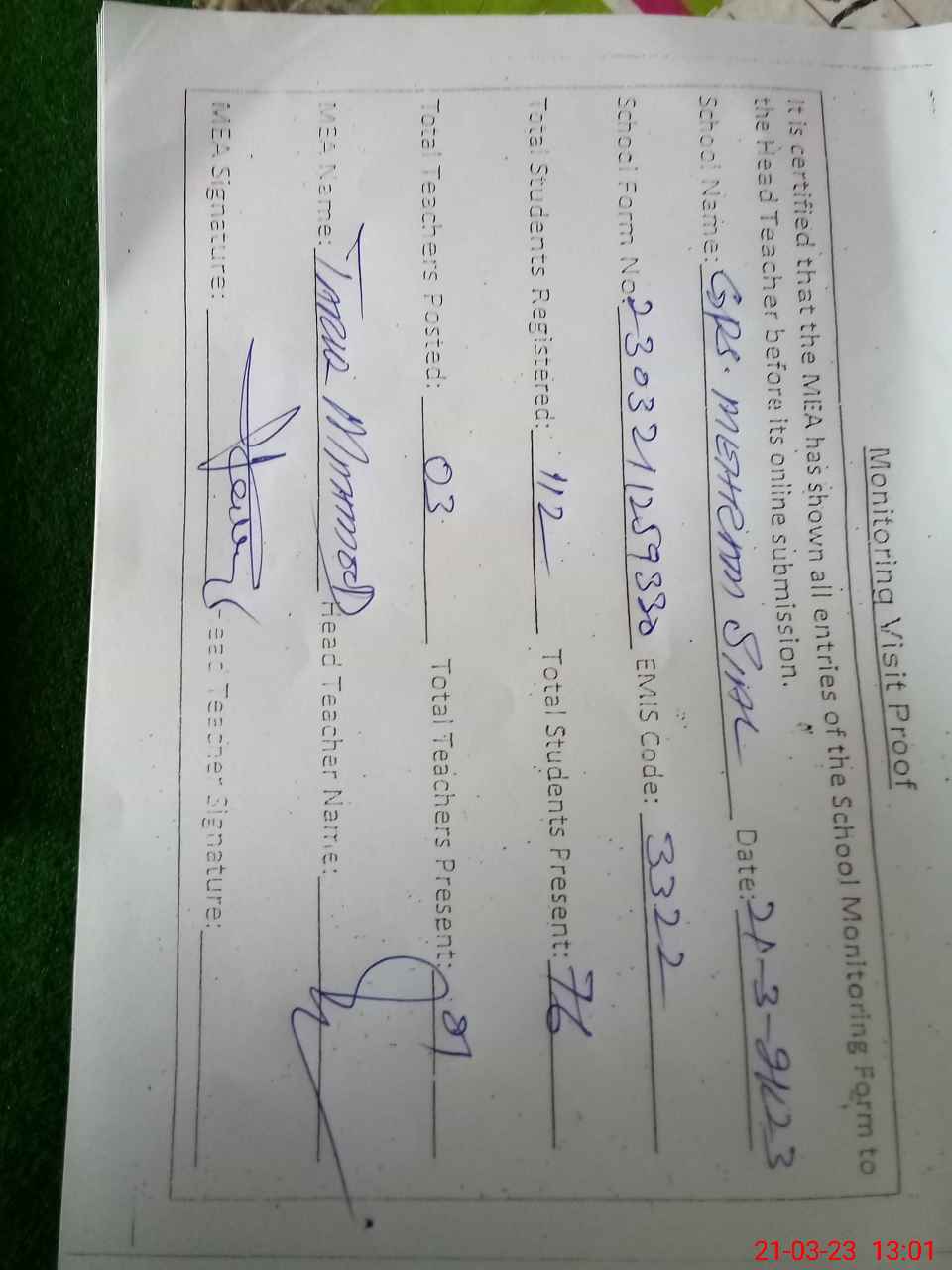 | EMIS Code: 33220463 | Name of School: GPS MEHRAM SIAL | |||