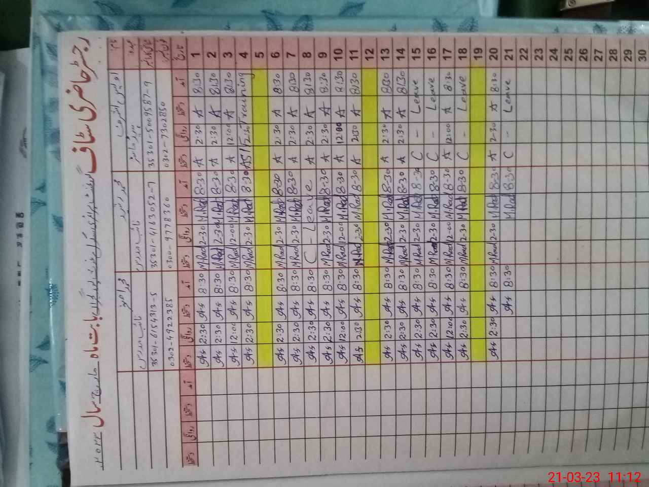 | CNIC | Full Name | Designation | R/C | Absence During Last Calender Month |