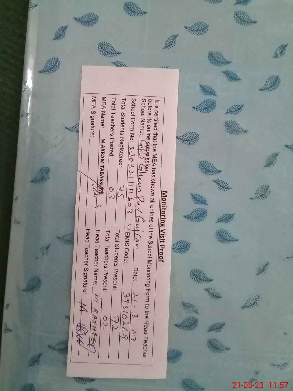 | Attendance Register | Head Teacher | MEA with School | Visit Proof |