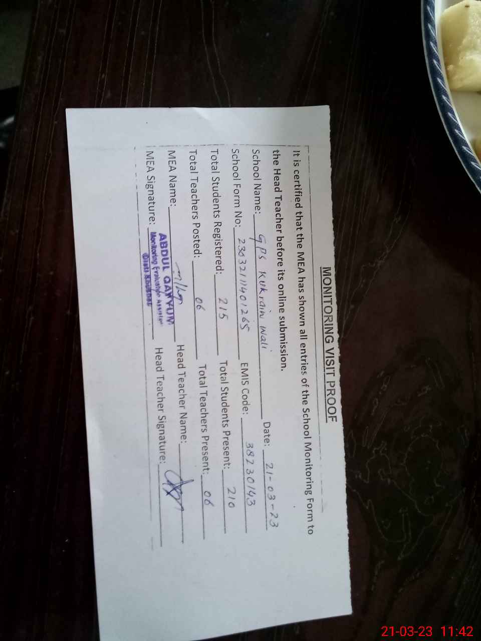 | Certified that this School was Inspected by the Undersigned MEA/DMO Today and the Information Stated Above is as Per Record. | |||||