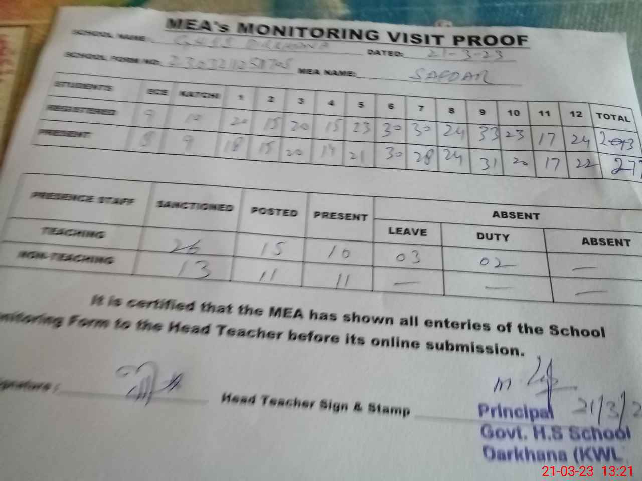 | Attendance Register | Head Teacher | MEA with School | Visit Proof |