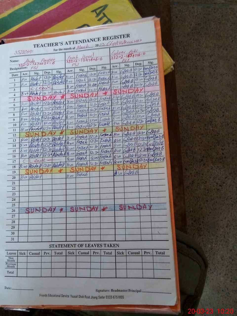 | CNIC | Full Name | Designation | R/C | Absence During Last Calender Month |