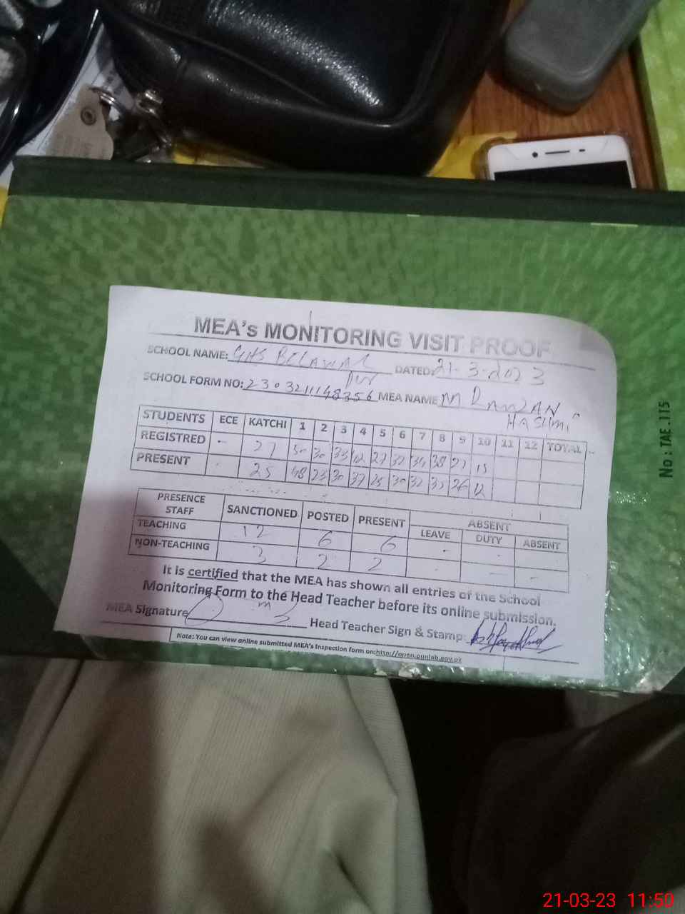 | Attendance Register | Head Teacher | MEA with School | Visit Proof |