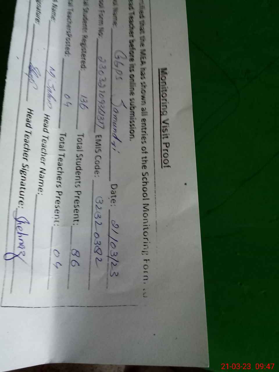 | Name: Sh**** Designation: (School Headmaster's/Headmistress's) Pst Phone/Cell Number: 03**** |
