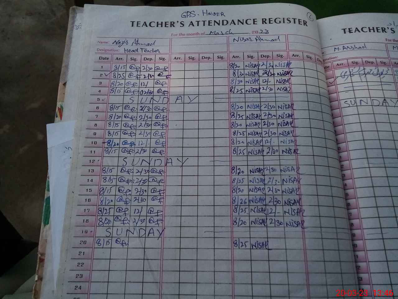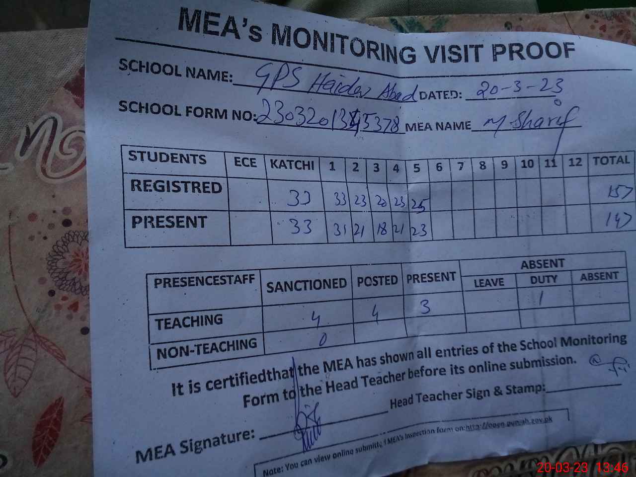| Attendance Register | Head Teacher | MEA with School | Visit Proof |