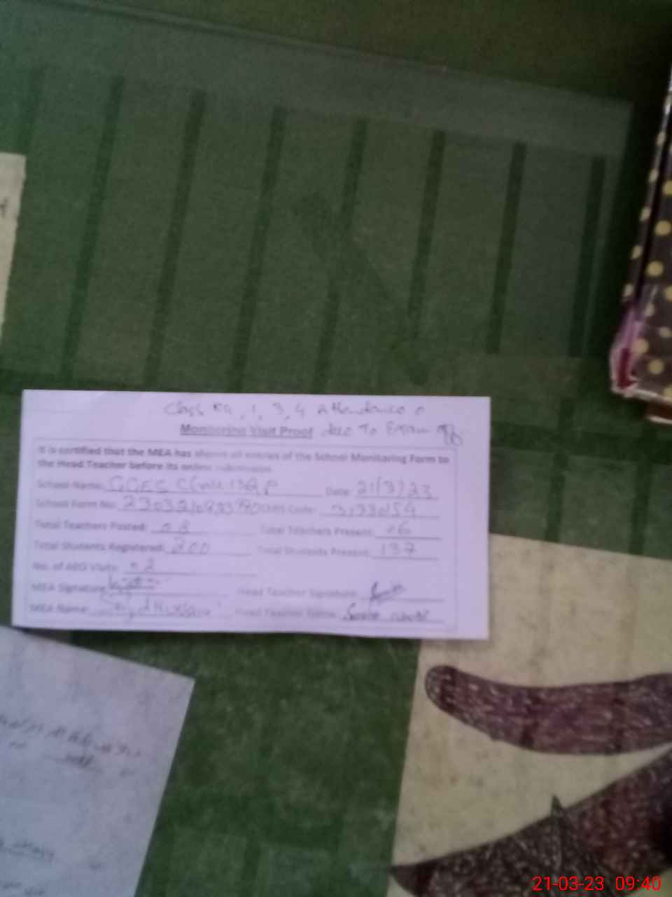 | Attendance Register | Head Teacher | MEA with School | Visit Proof |