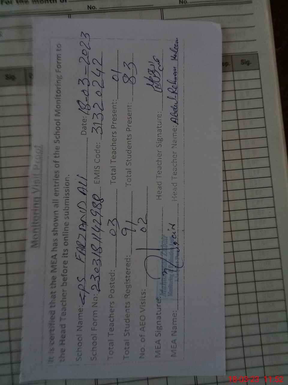 | Attendance Register | Head Teacher | MEA with School | Visit Proof |