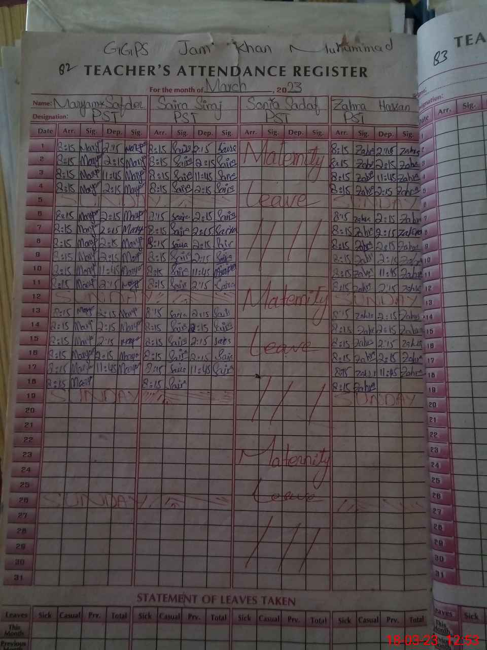 | Leave | Duty | Absent | Maternity | Medical | Ex- Pak |