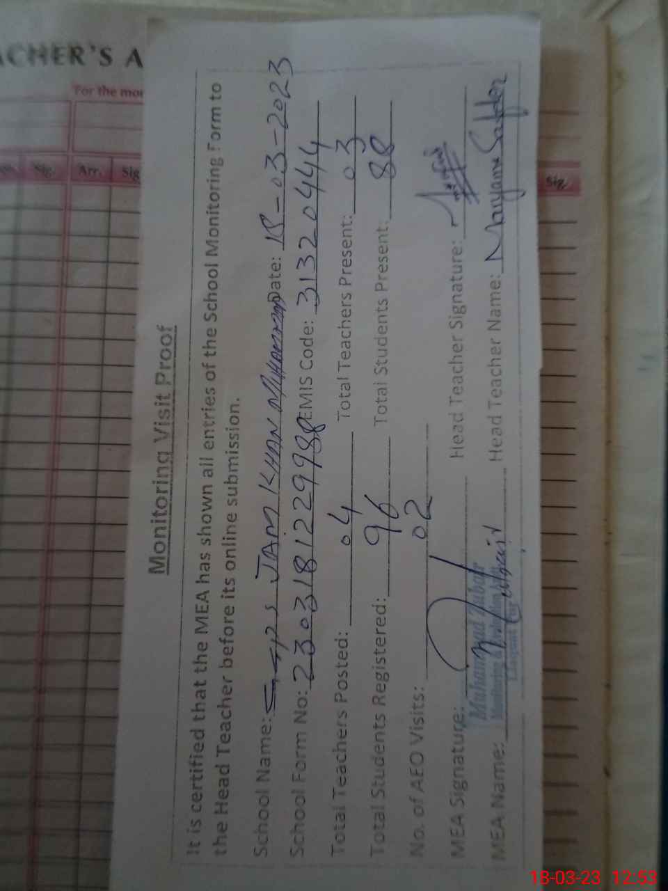 | Attendance Register | Head Teacher | MEA with School | Visit Proof |