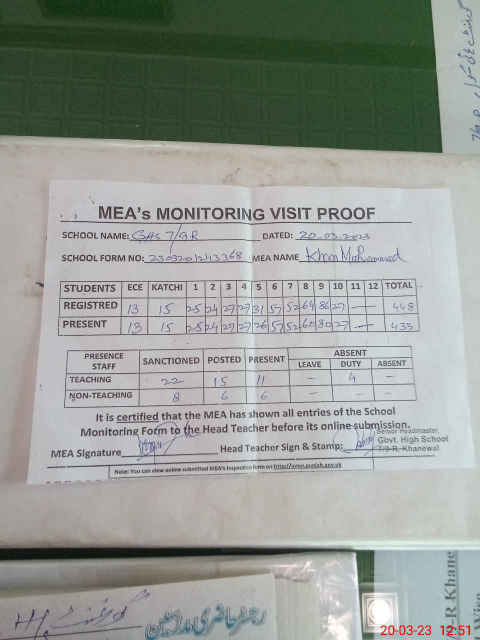 | Attendance Register | Head Teacher | MEA with School | Visit Proof |