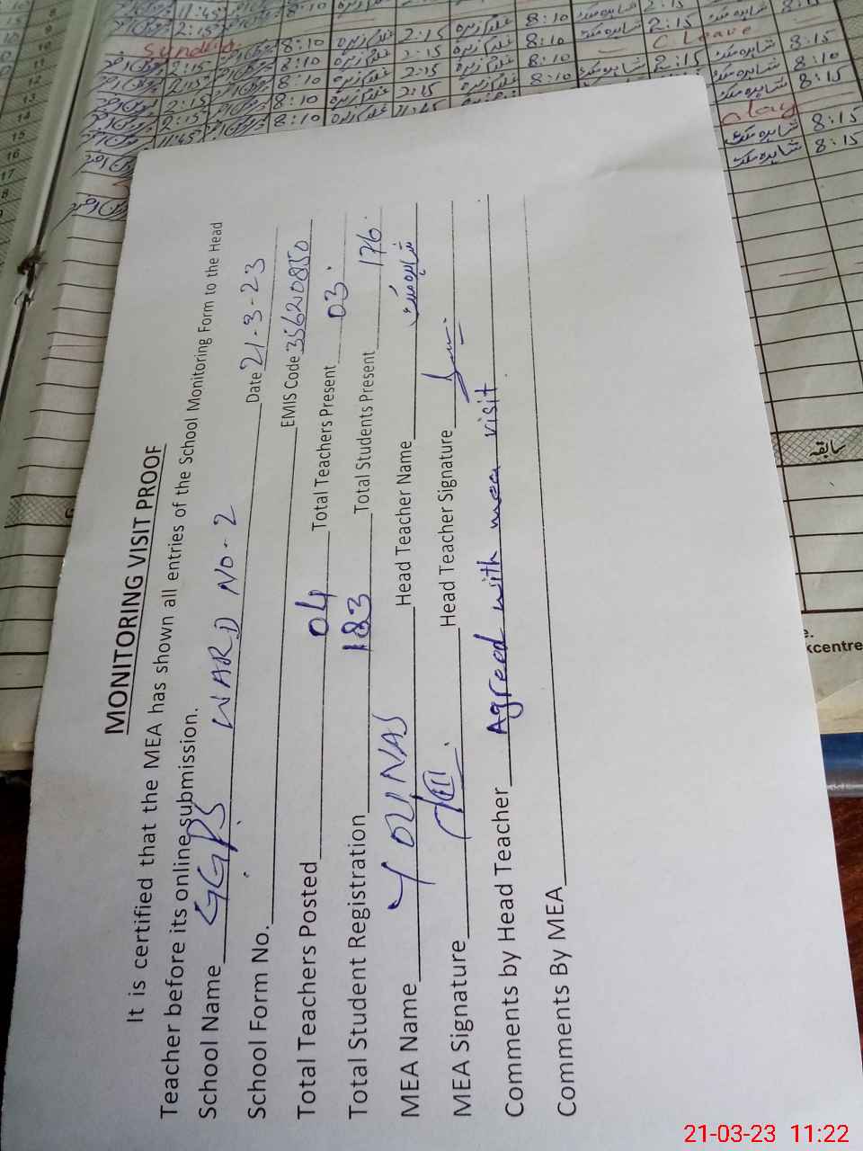 | Attendance Register | Head Teacher | MEA with School | Visit Proof |