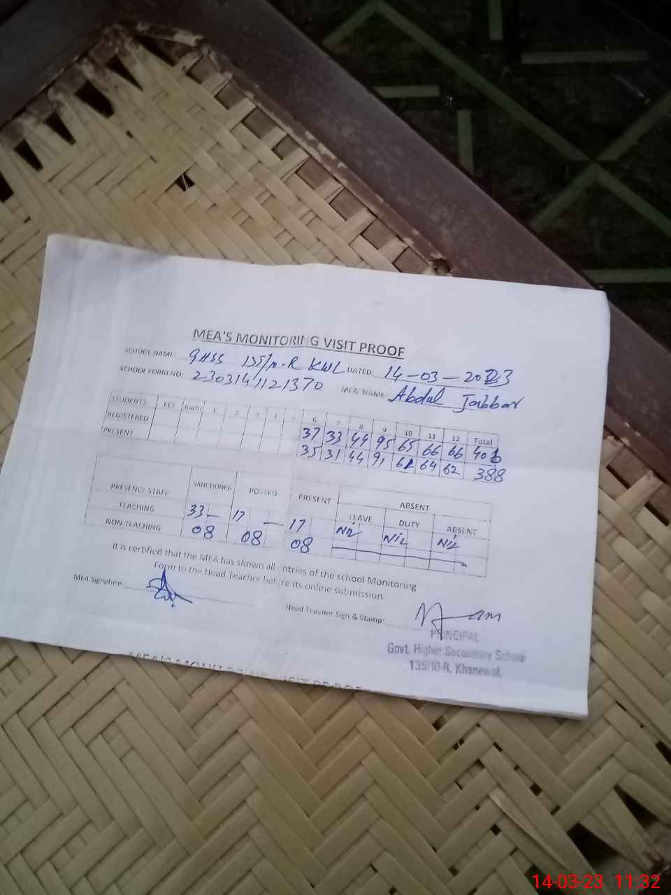 | Attendance Register | Head Teacher | MEA with School | Visit Proof |