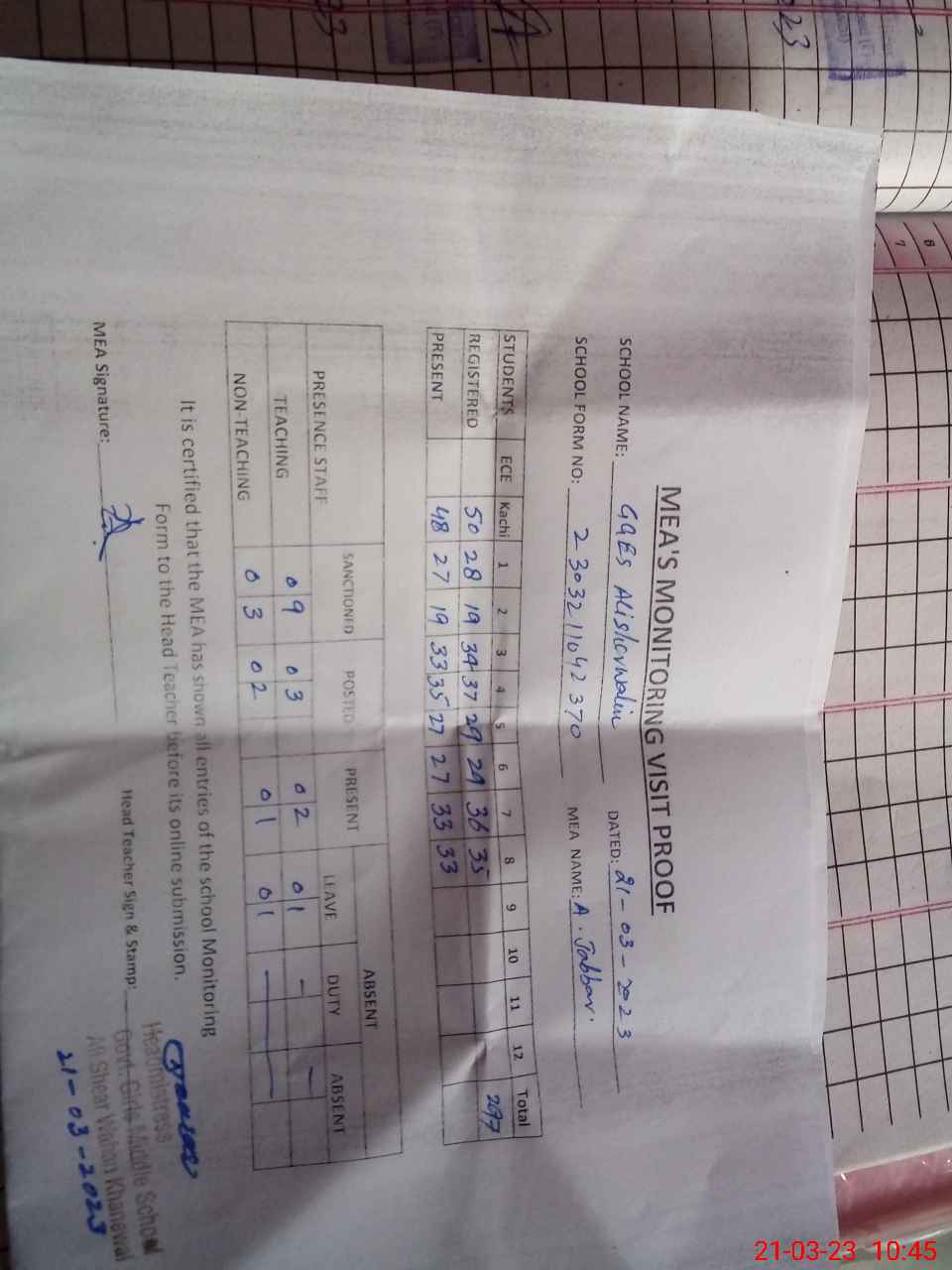 | Attendance Register | Head Teacher | MEA with School | Visit Proof |