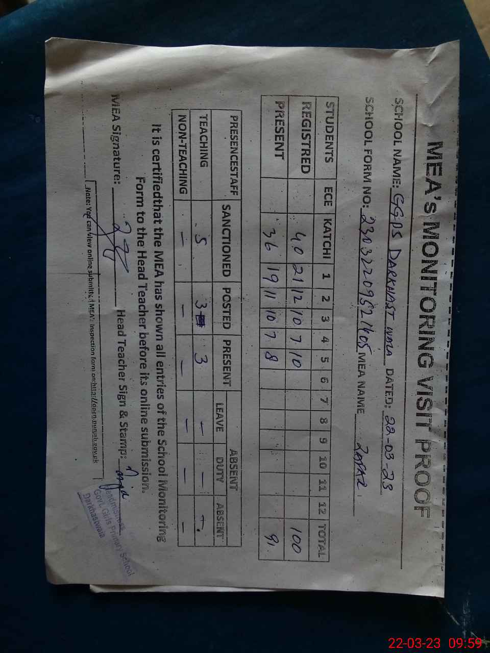| Attendance Register | Head Teacher | MEA with School | Visit Proof |
